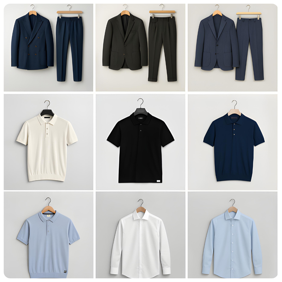 3 suits, 4 knit polos, 2 stretch collar shirts